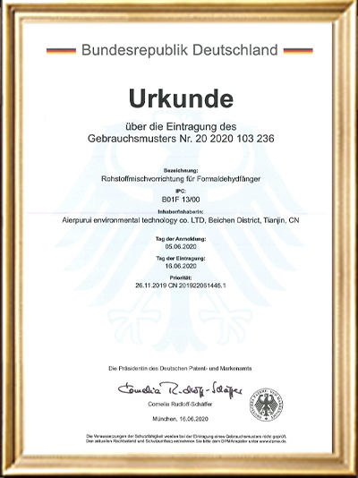 • 實(shí)用新型專利證書(一種甲醛清除劑的原料混合