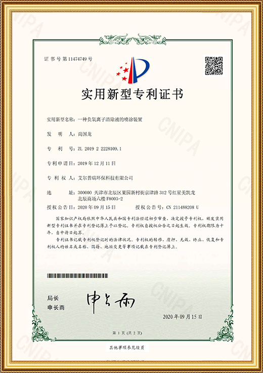 • 實(shí)用新型專利證書(一種負(fù)氧離子清除液的噴涂